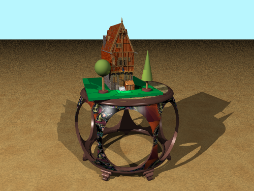 table, with a model of a medieval house as a toy on top.