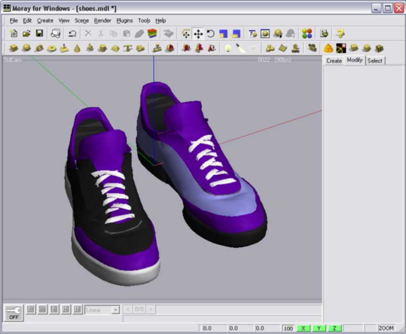 >A highly-detailed pair of sneakers imported from VRML2.0 to Moray and >(badly) colored by me. This was done with the (not yet released) full >version of the Triangle Mesh Importer plugin, available on >www.thenerdshow.com.>> Unfortunately, the free version of the plugin won't work for such large > files (yet). And the full version is still under development.>> The original VRML2.0 object came from a library that some guy had > converted from DXF and posted here > http://www.eecs.harvard.edu/~gotsman/rendering/vrml/>> Henry>>