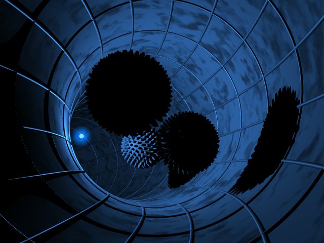 > So I was bored and had no ideas so I put the camera> inside a torus, threw in some spiky spheres. Then I played> with the lighting for a bit.