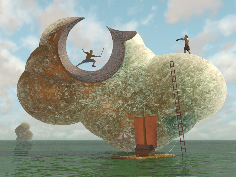 >is CSG, knicked from the net or UV mapped Poser figures. The clouds are