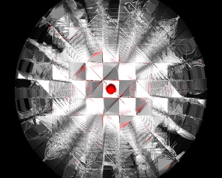 large black sphere containing the disc and the red dot. The disc and the