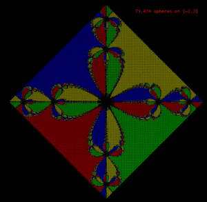 > Fractal based off of roots of an equation in the complex plane. Each color