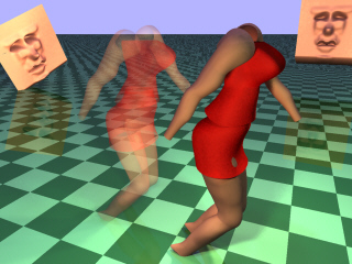 That is a great image. ( the thigh showing through the dress needs fixing ) Not sure about the checkered plane, maybe textures inside the checkers? or some other geometric pattern?