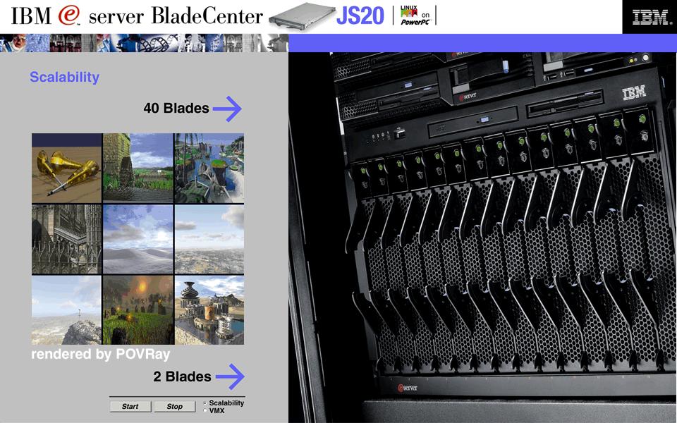 Here's a shot of the IBM JS20 demo featuring POV at the CeBIT show .