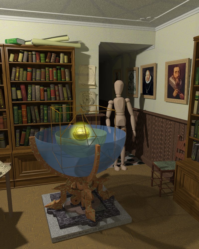 Brahe and Johannes Kepler. The drawings on the wall show the Kepler system