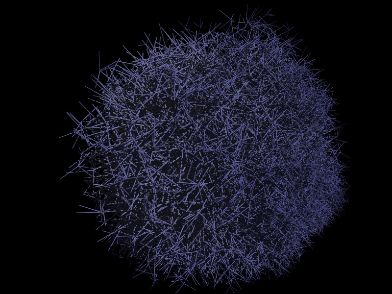 P=p+vnormalize(<rand(r),rand(r),rand(r)>-.5)*(.5-l)*.5;cone{p+z,(.5-l)/100,P+z,(.5-vlength(P))/100pigment{rgb(1-l+z*l)}}#if(n>0)L(p,n-1,m,r)#end#if(m)L(P,3,m-1,r)#end#end