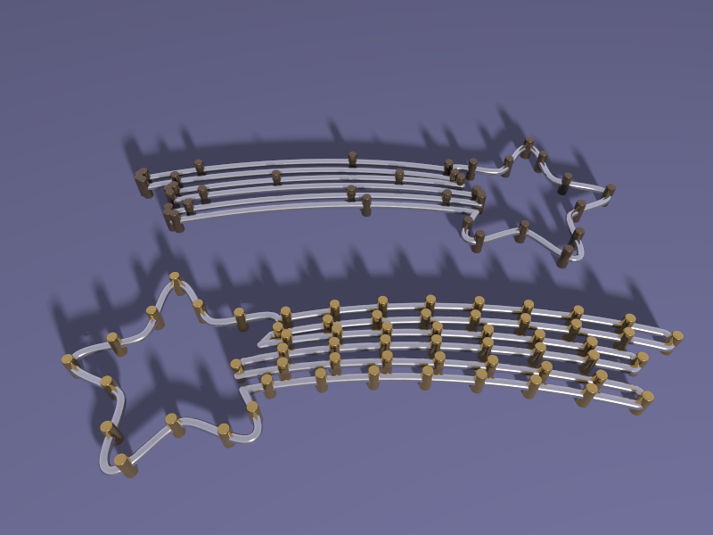 This image is a demo of the bezier spline macros.  The bronze pegs are