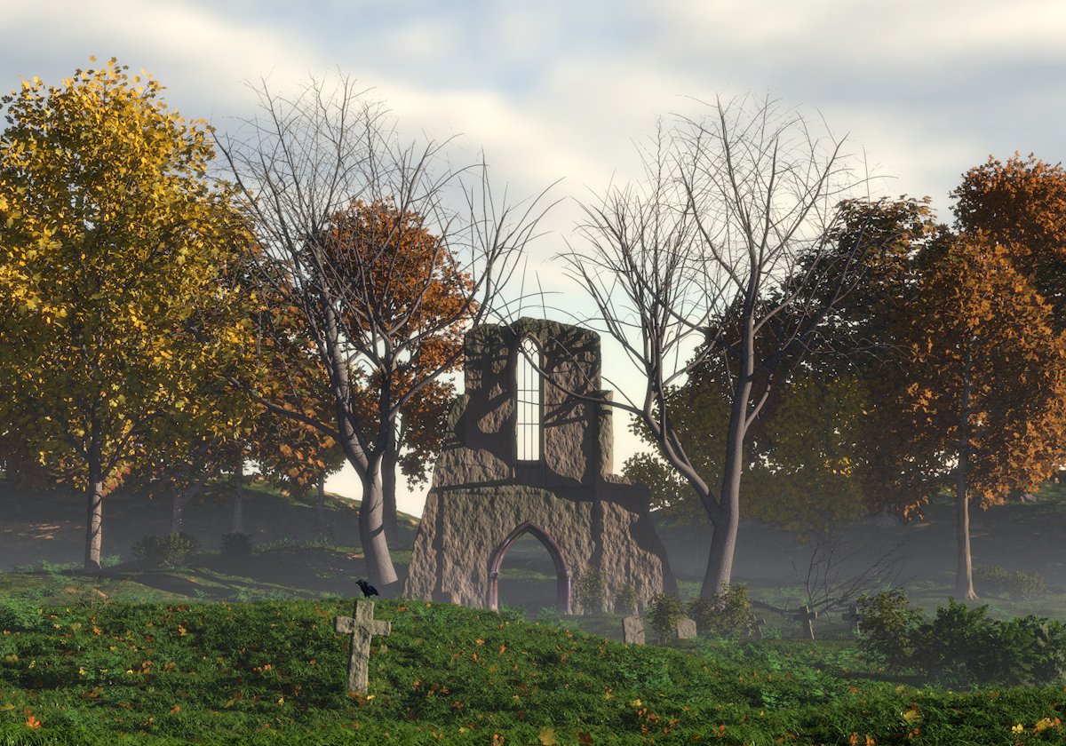 The ruin is made of spline based isosurfaces and the gravestones are