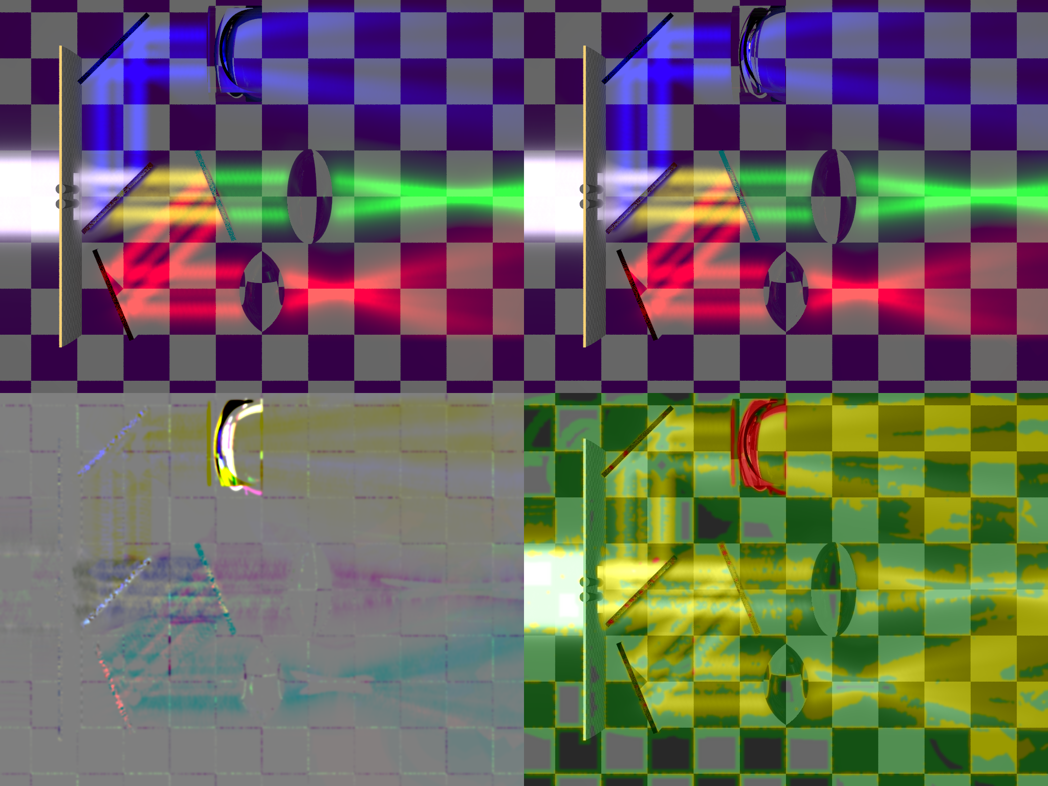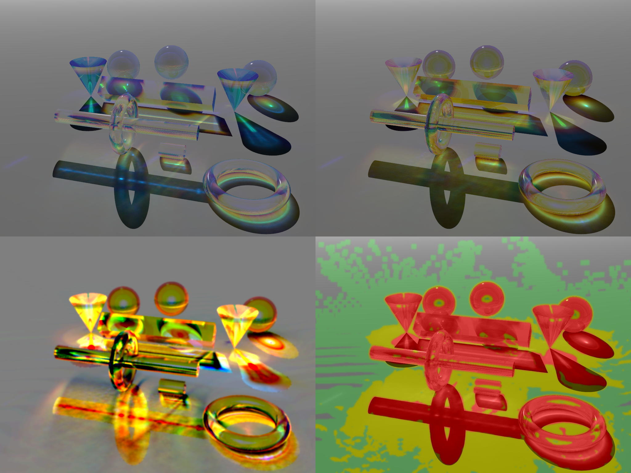 The "optics.pov" sample scene rendered with POV-Ray 3.6.1 (top left) and