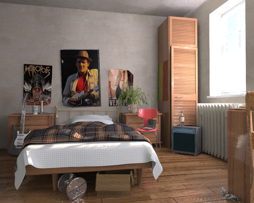 + The bed sheet needs some subdivision, but this was on the original scene.