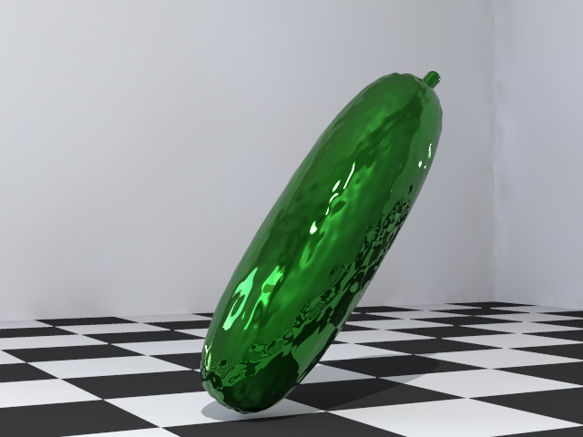 Reflective cucumber over checkered plane.