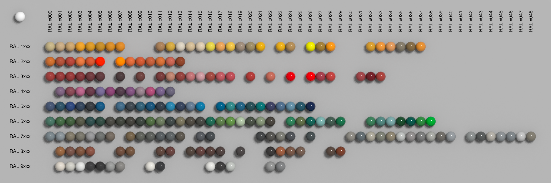 > Collection of RAL Classic (matte) paints, plus a Spectralon sphere for