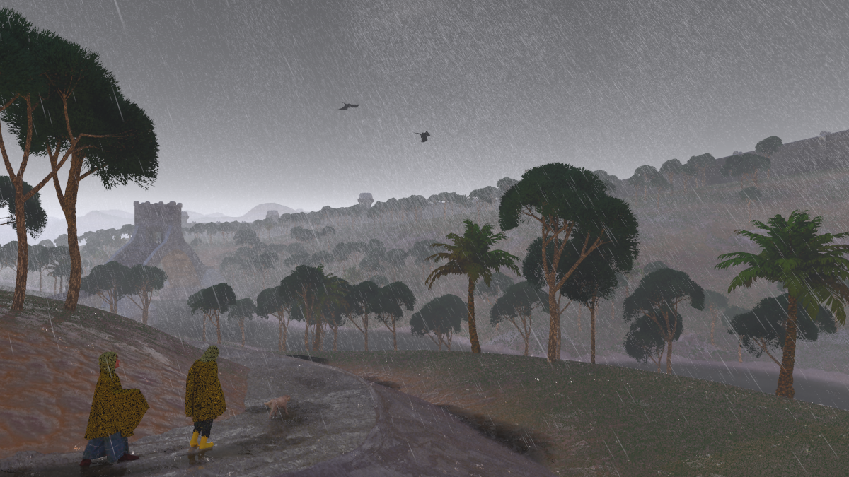 Hey, what..? A medieval place, but people with modern yellow rain coats