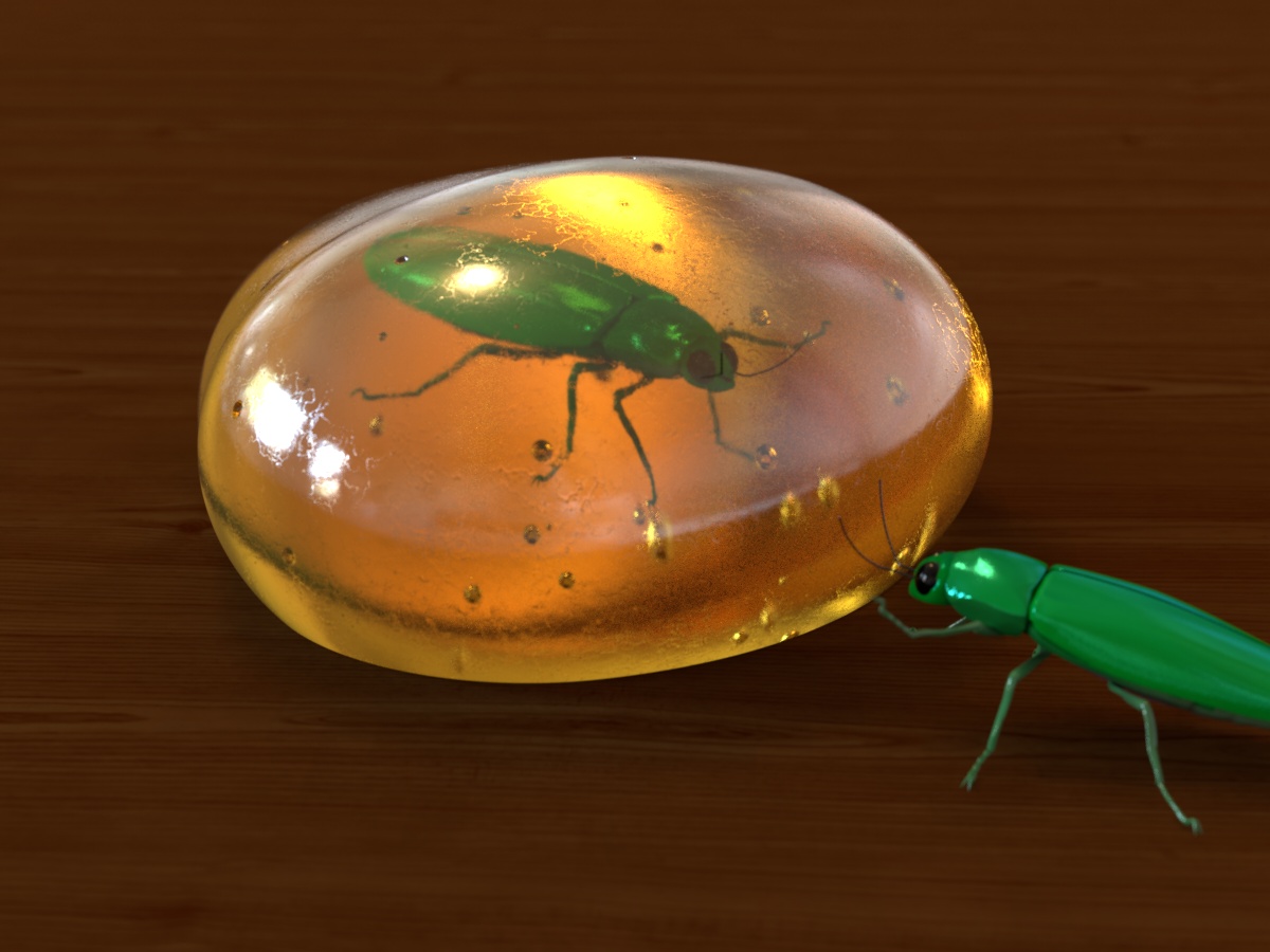 The bug looking at the other bug in the amber piece : «Great grandpa...