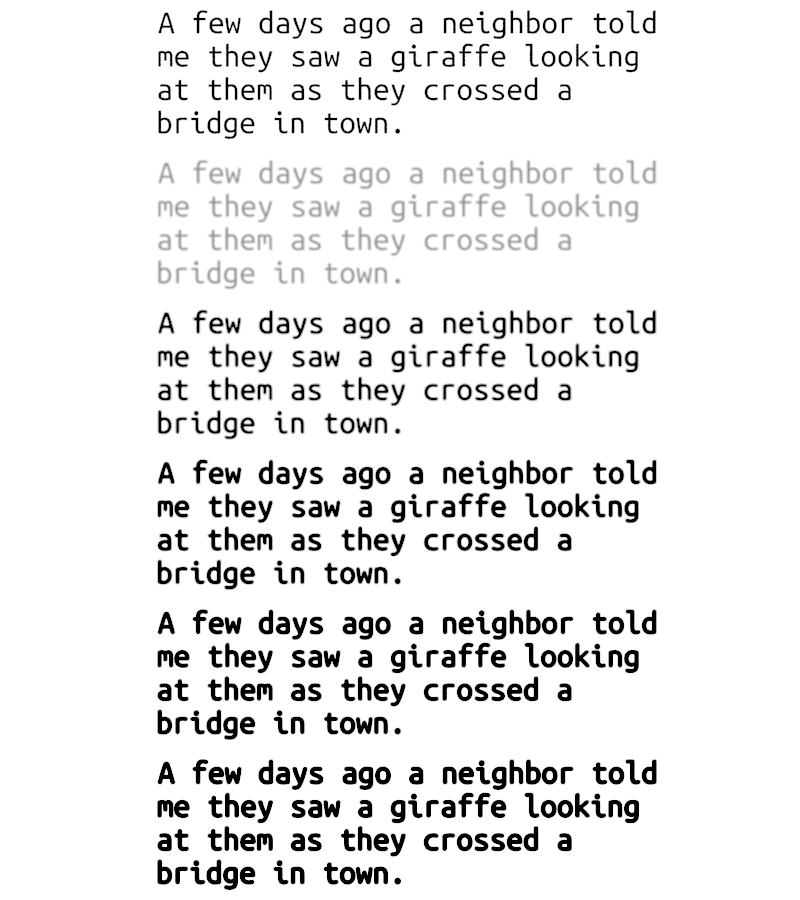 The remaining five sub-images turn off AA and removed the visible text