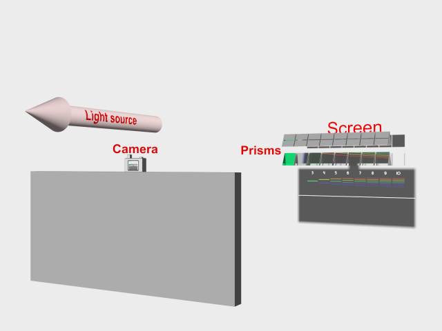 prisms in the top row cast a narrow slit of photons onto the screen right