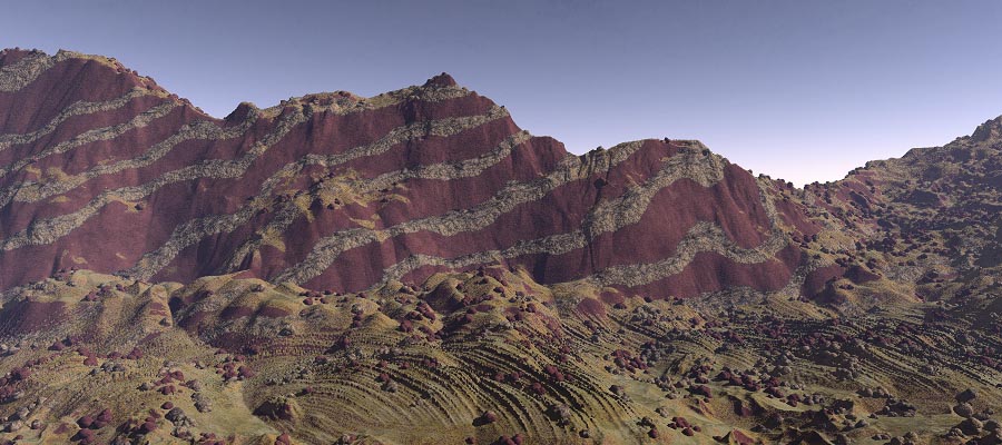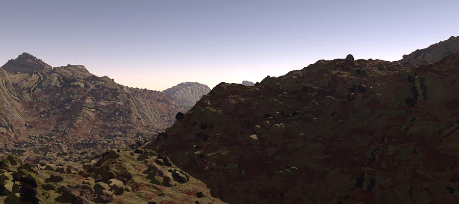 flatter surfaces. The landscape is then scattered with boulders using the