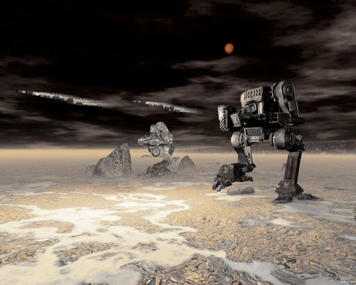 > I call this one "Skirmish on Alkaid">> The 1024x768 version is at>> http://www.mechdropzone.com/image_pages/image51.html>> I used Moray 3.5 to speed up the modeling.>>