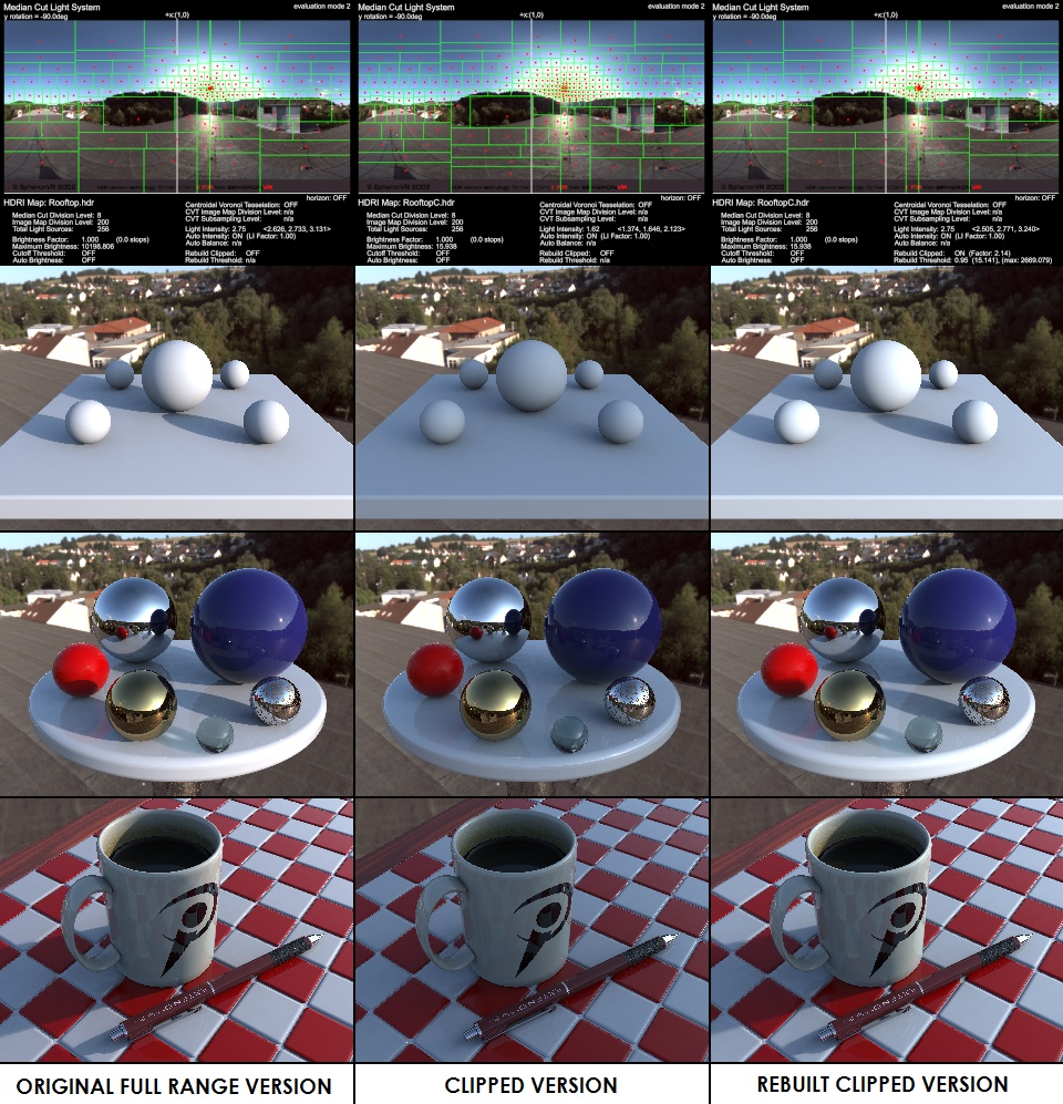 The 3rd column shows the scenes using the clipped version of the HDRI, but