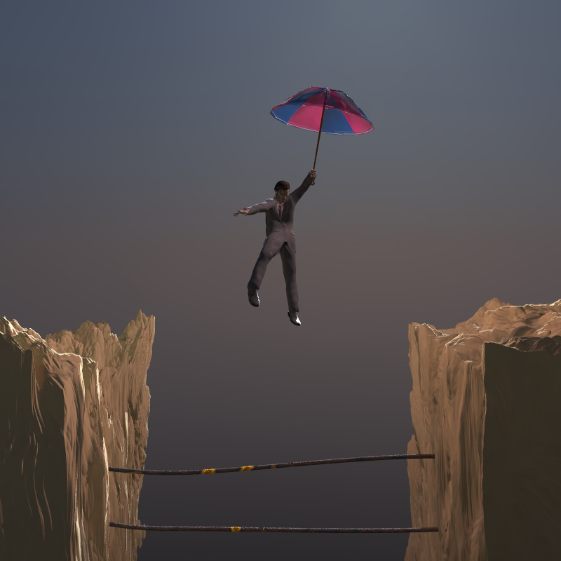 Or he could be descending using the umbrella as a parachute, or just