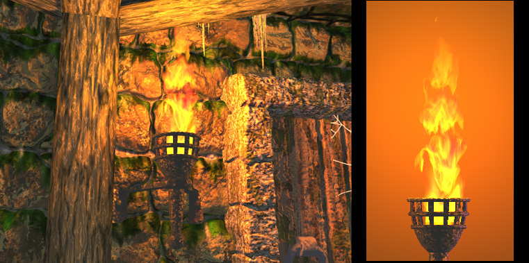 Each flame has four randomly 'dancing' areas_lights to cast shadows; looks quite