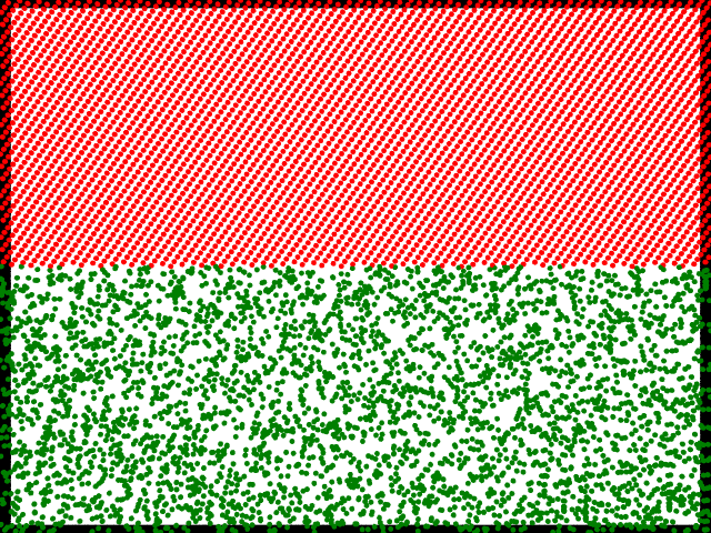 The neatly ordered, predictable pattern of red dots in the top half of the image