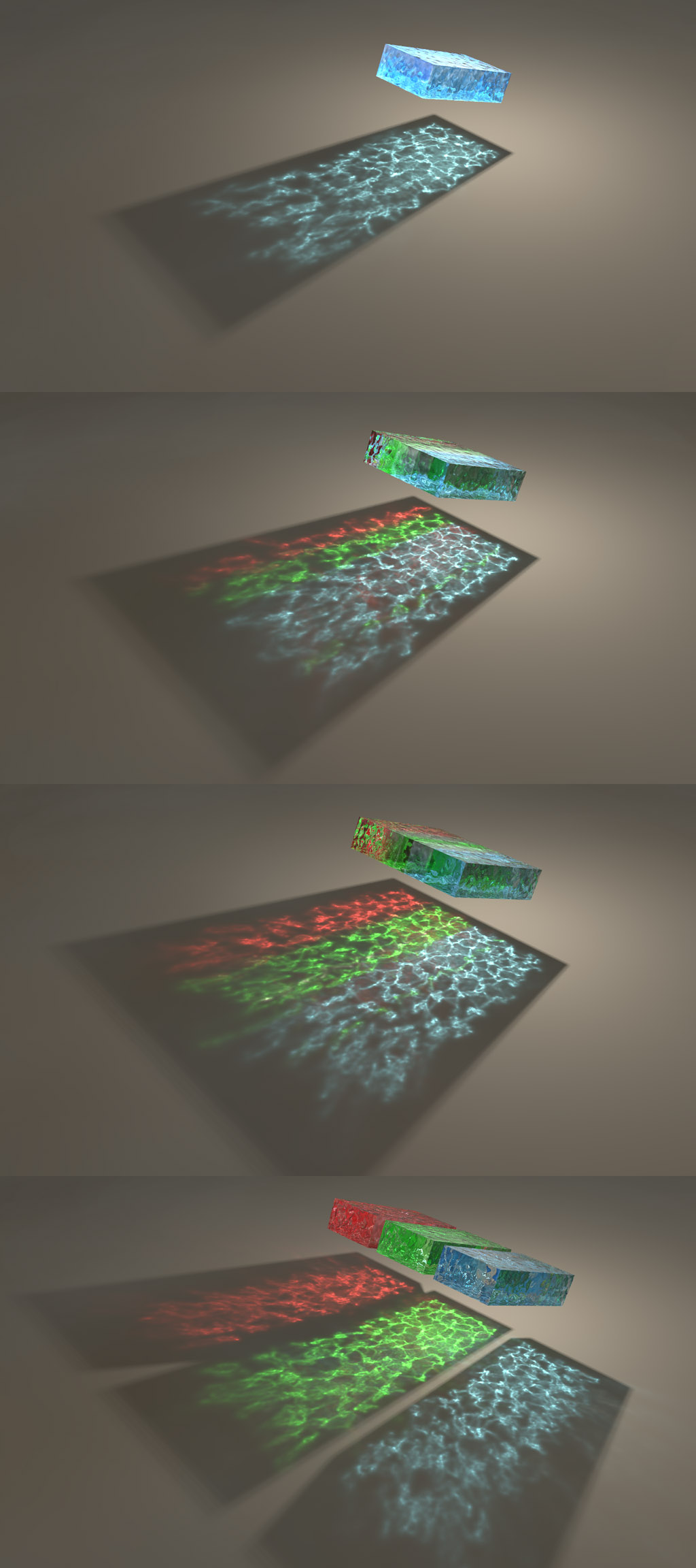 caustics emanating from 3 colored "water" blocks - here are some "time-lapse"