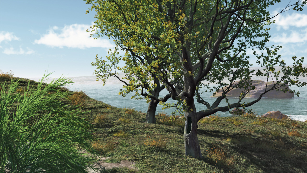 > One (with custom leaves), a bamboo shrub, and various grass patches on a height