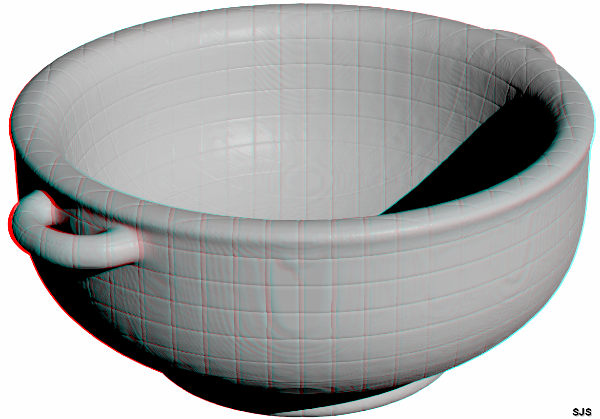 A gray scale anaglyph viewable with red/cyan 3d glasses.