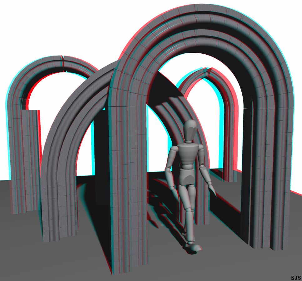 A gray scale anaglyph viewable with red/cyan 3d glasses.