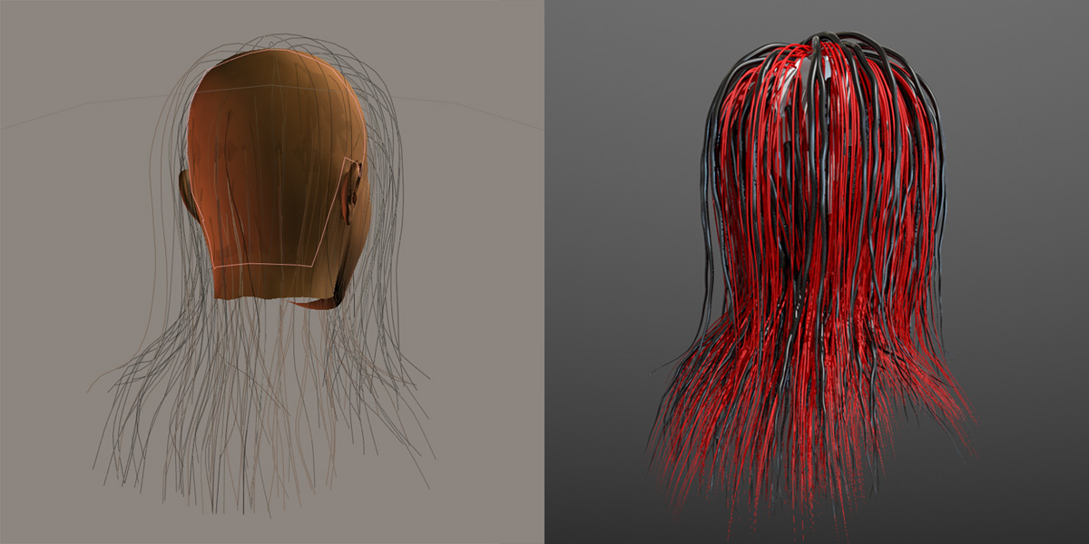 Poser hair guides on the left, "proof of concept" test render of 500 red,