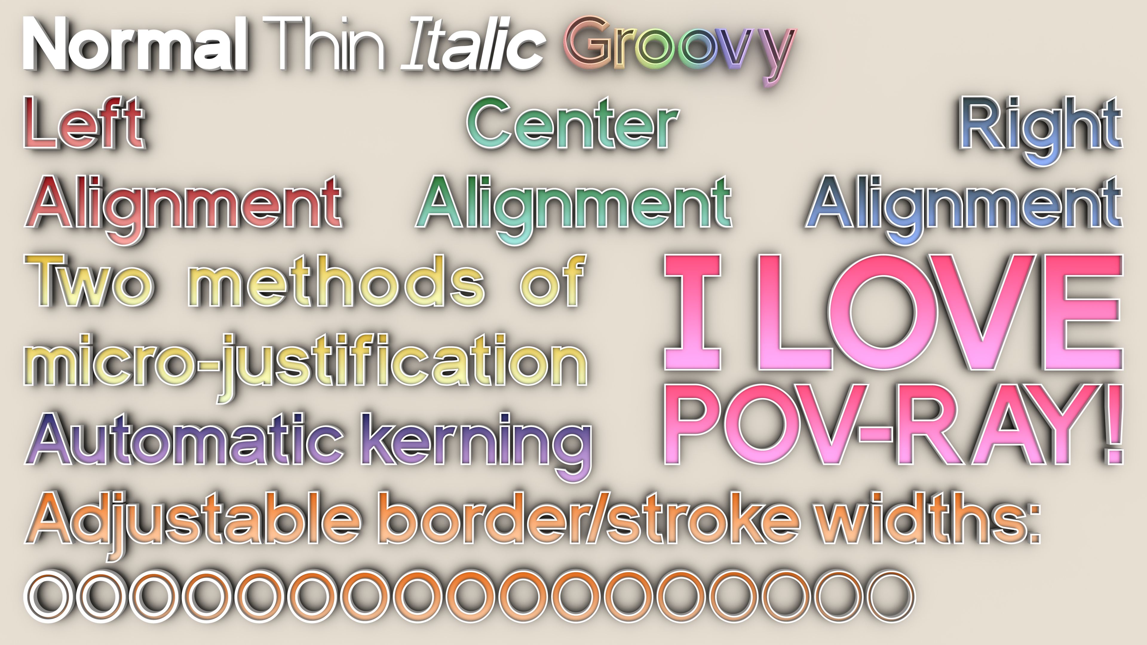 > The demo files included with the Bordered Characters macros (posted in the> povray.binaries.scene-files forum) take a long time to render at high quality> settings so here are the major ones in 3840 x 2160 resolution.>> Regards,> Dave Blandston>