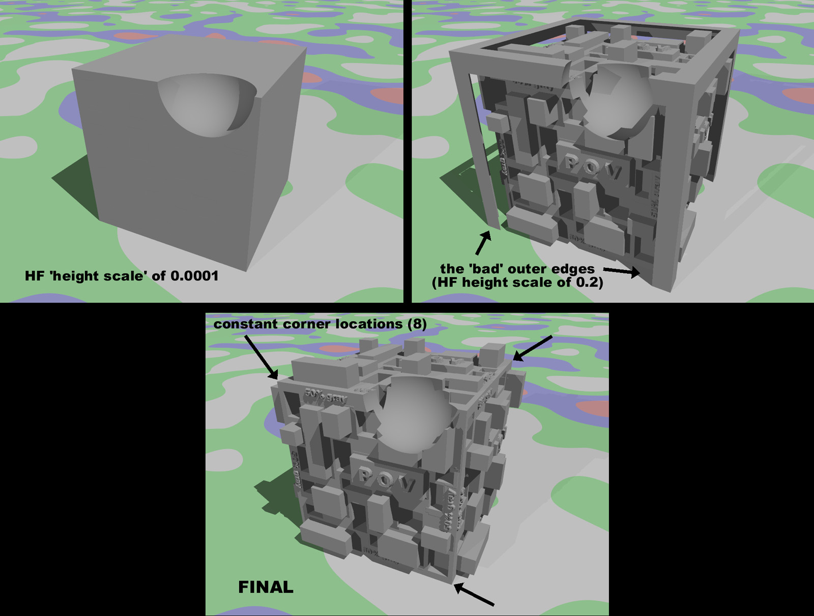 My current overall idea is to use vertical height_fields for the *faces* of the