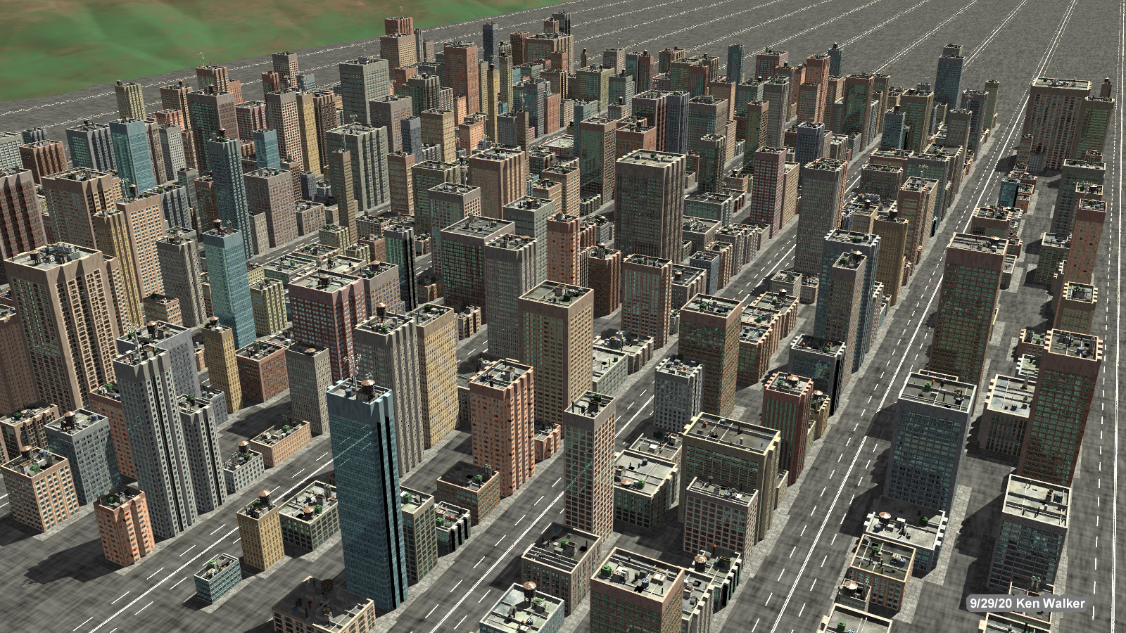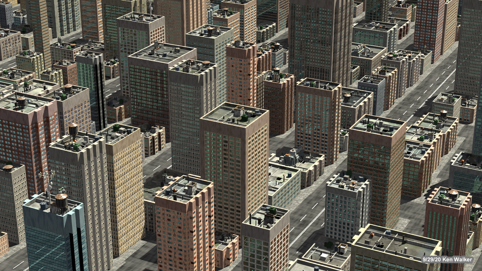 There are 650 buildings in this shot, randomly using 34 'real' image_maps for
