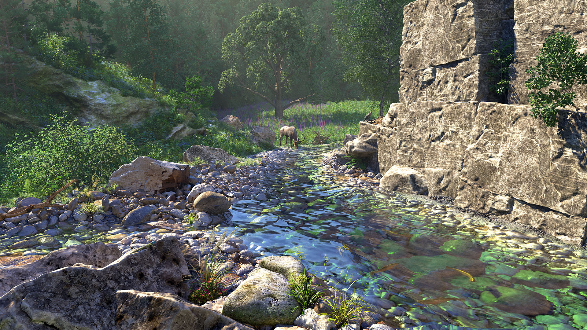 > Starting point of the image was a 76 MB obj file with stones and water.