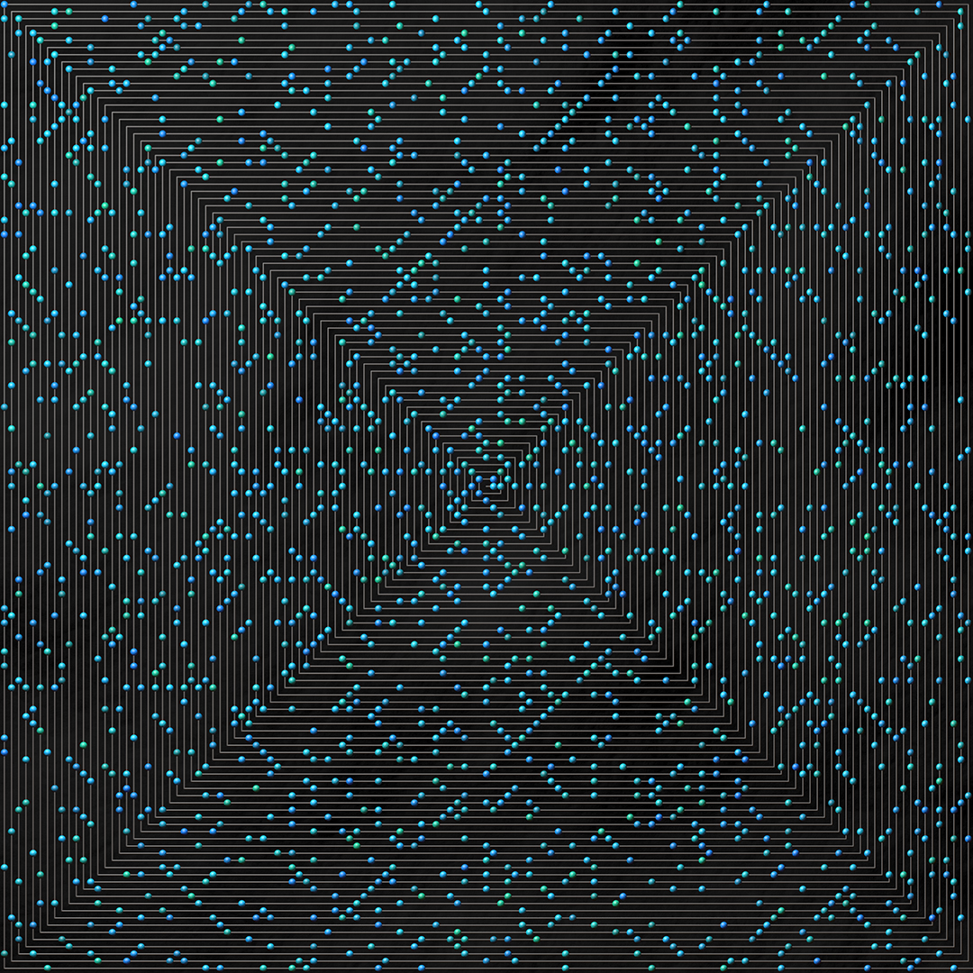 > A simple Ulam spiral displaying the locations of the first 2088 prime numbers (2