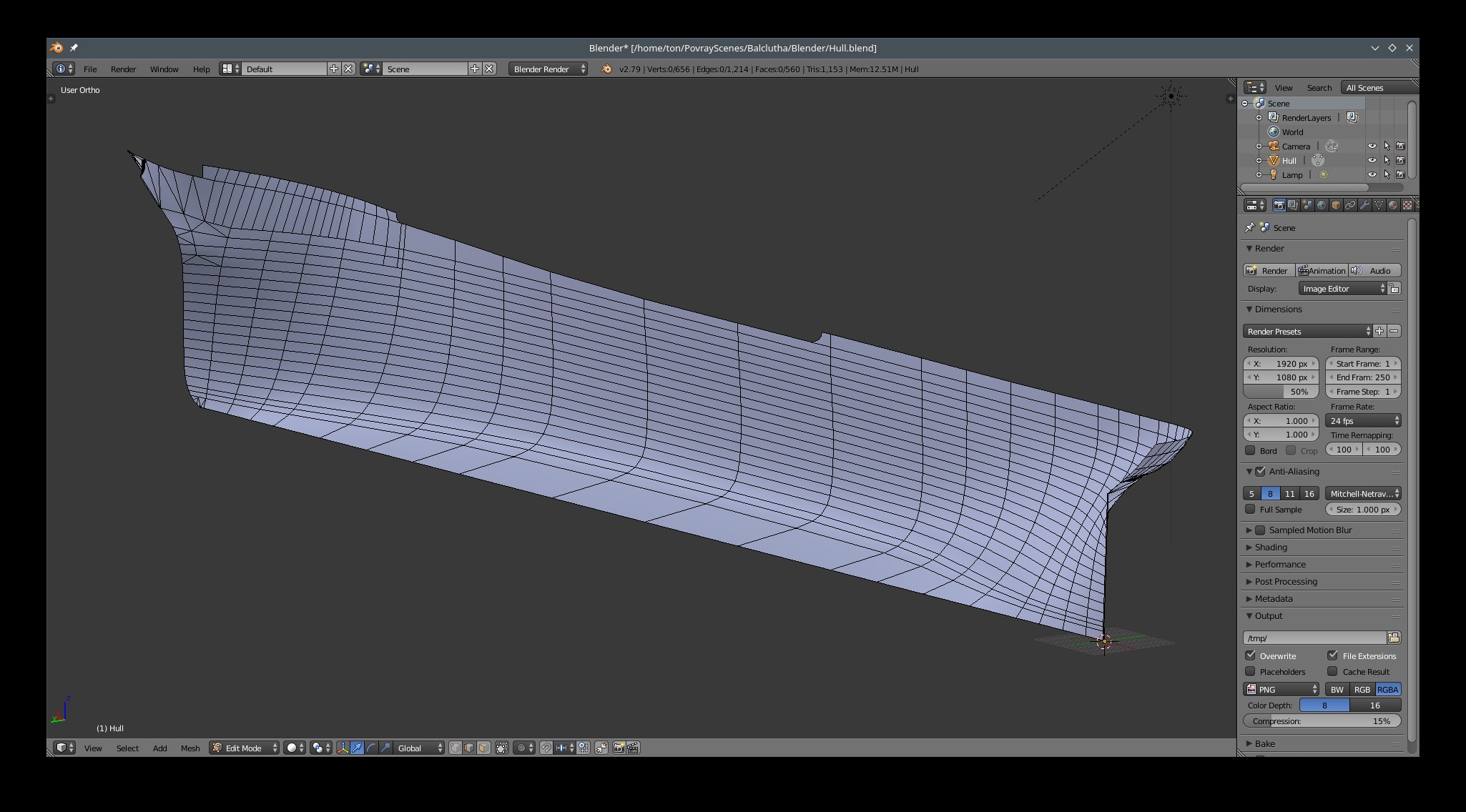 I have mirrored the hull, added the keel, which are povray objects from