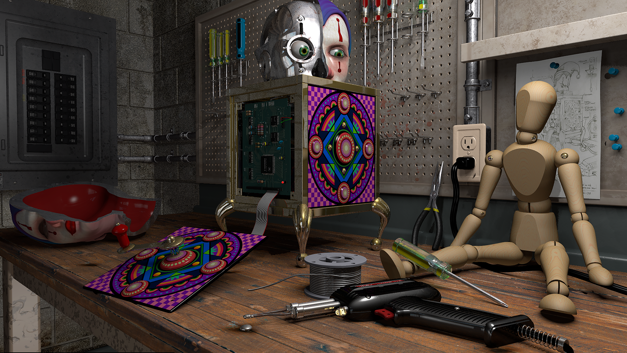 Progress rendering of workbench and Jack-in-box scene - low-res. Still modeling