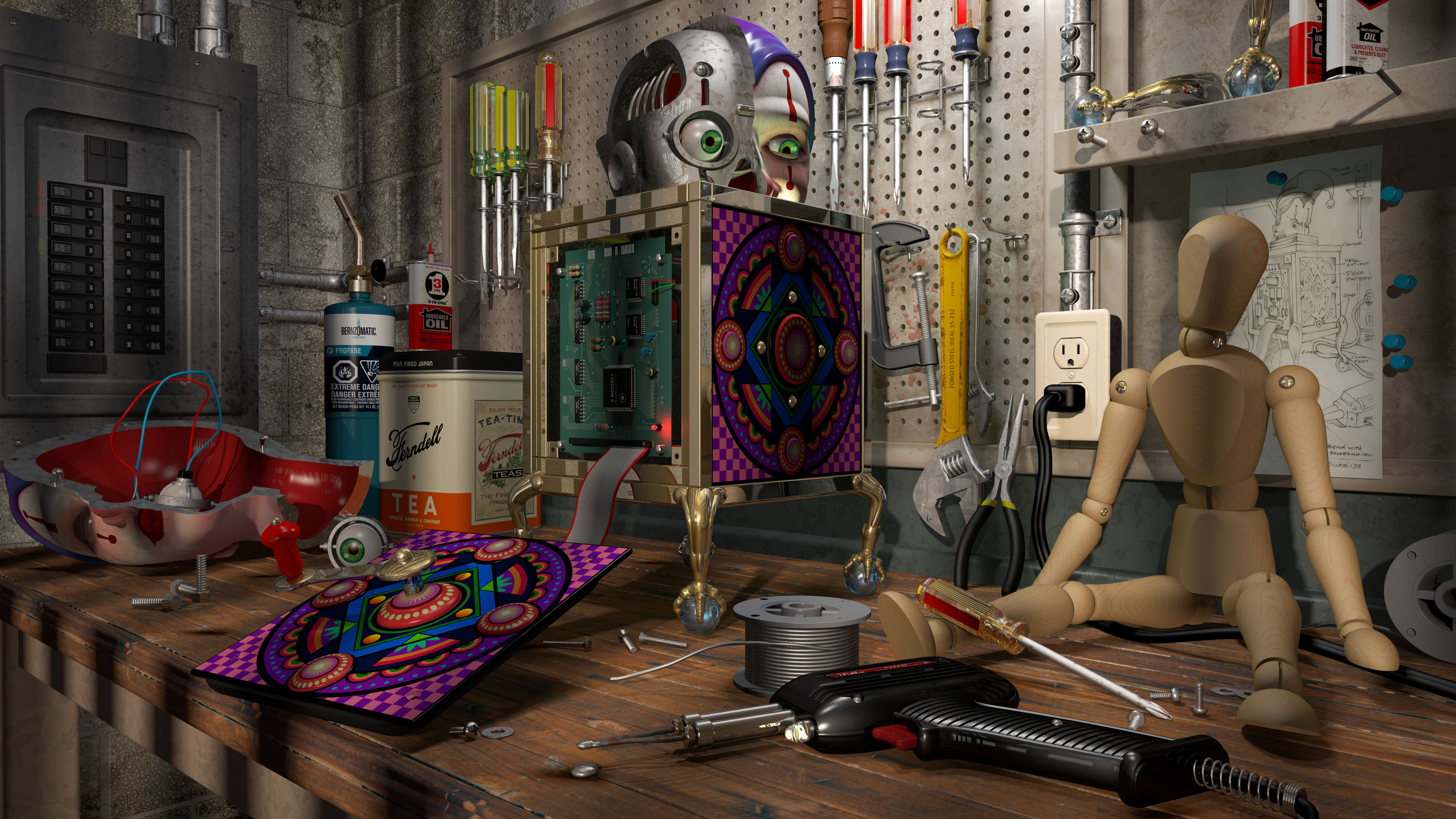 > Progress rendering of workbench and jack scene. Getting close to wrapping this> one up. I'm still modeling and tweaking materials on a few items.> Mike.