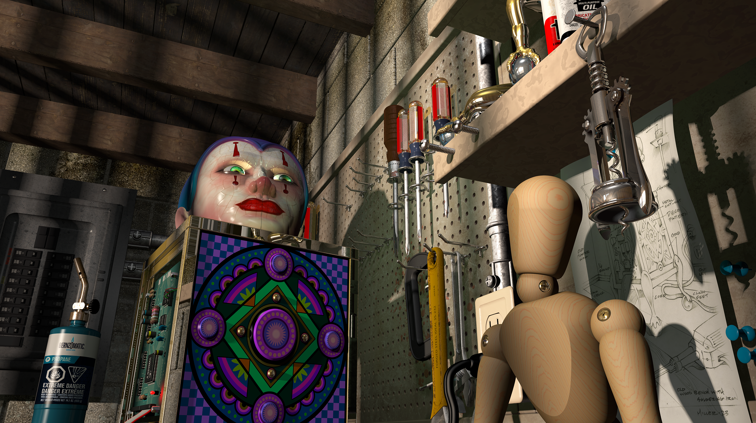 Progress rendering of workbench and Jack. Looking for interesting camera angles.