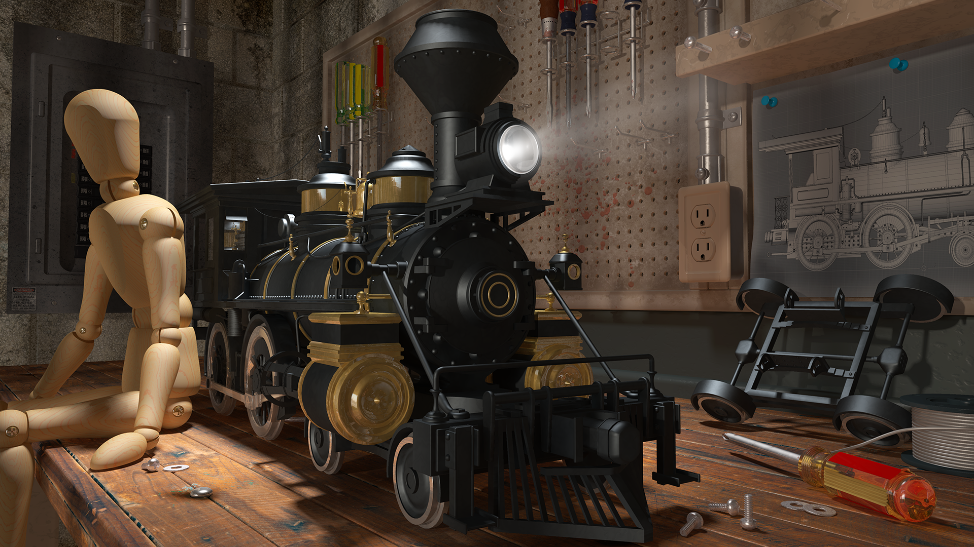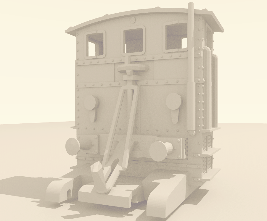 > Work in progress rendering of a train model. I cleared off my workbench to study