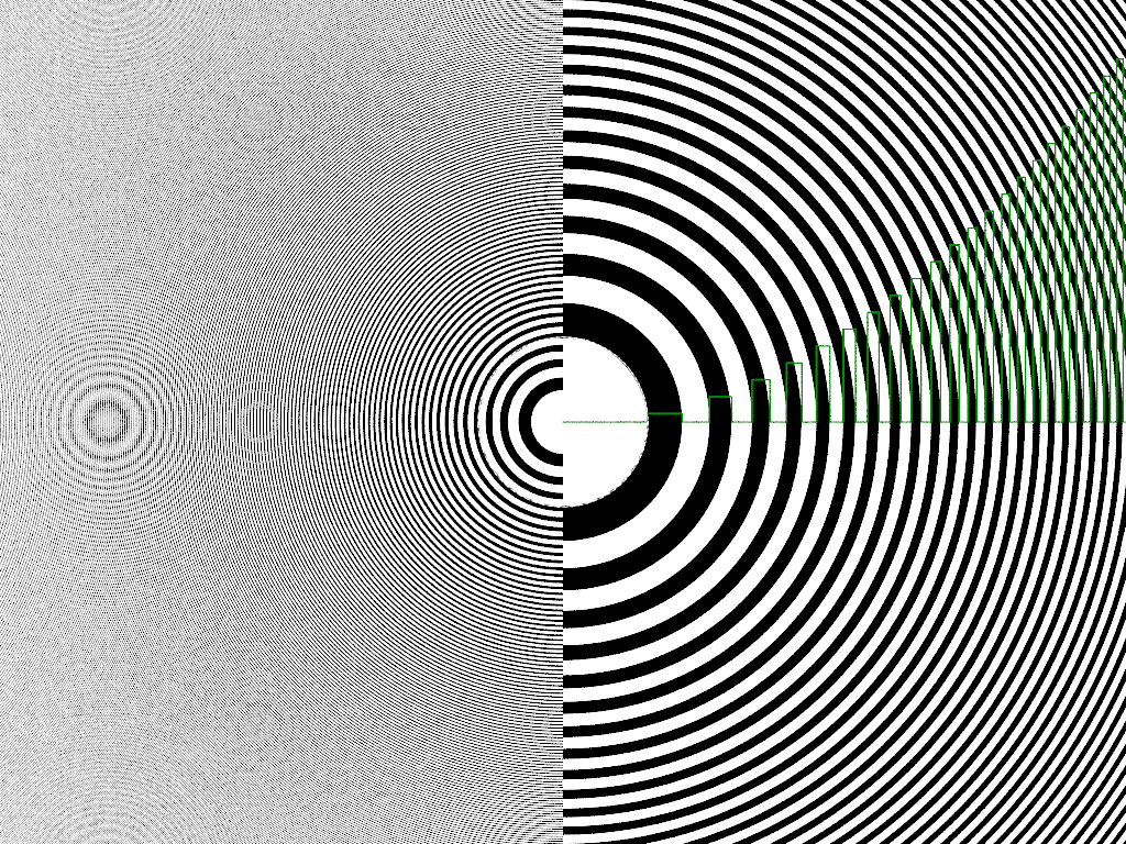#declare ZonePlate = function {ceil (mod (pow (d (x, y, z), 2), 2))}