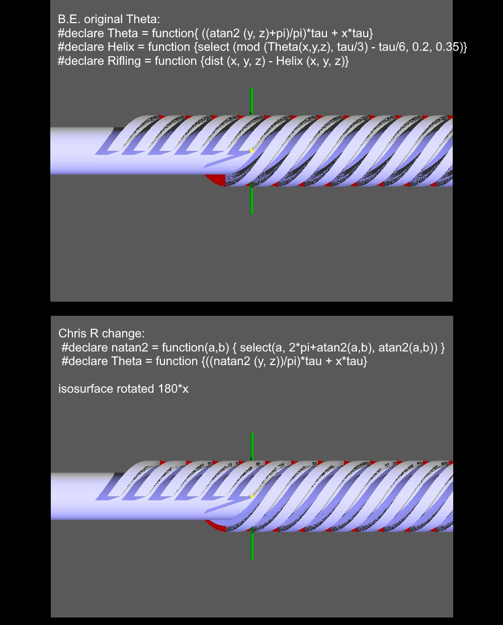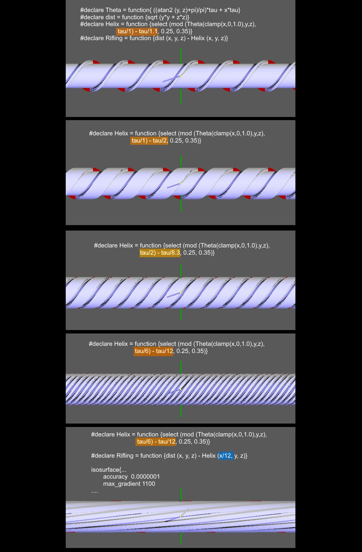 > #declare Rifling = function {dist (x, y, z) - Helix (x/12, y, z)}