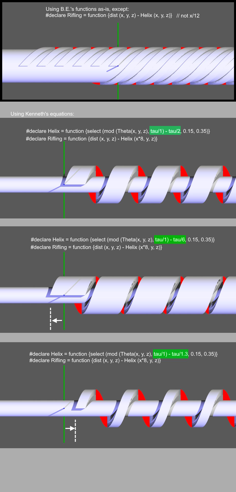 #declare Rifling = function {dist (x, y, z) - Helix (x*1 + 50, y, z)}