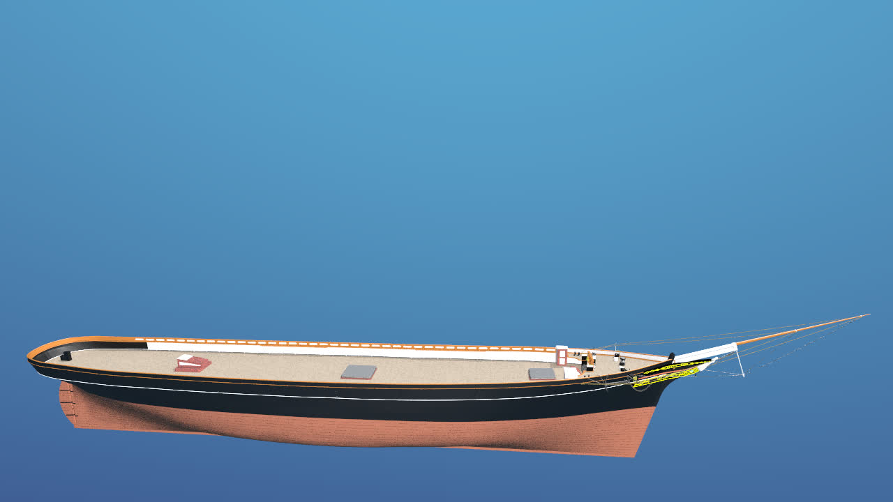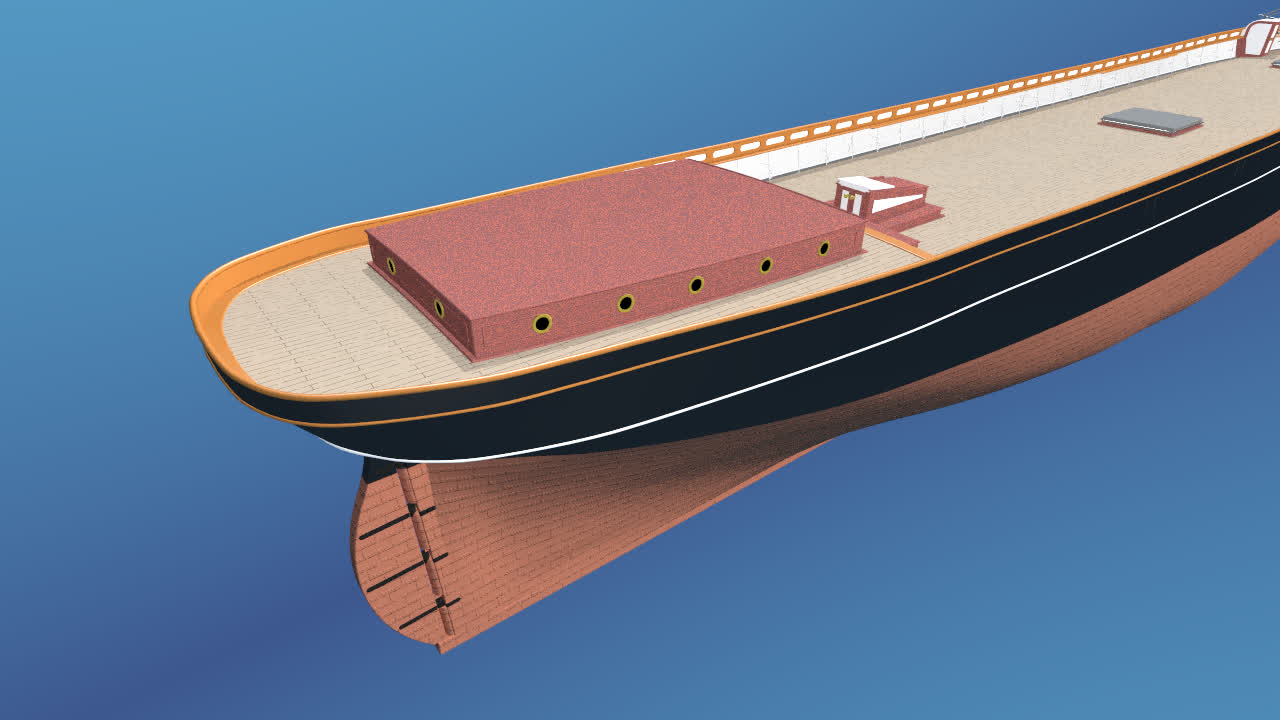 > The bell and compass on the poop deck, the rudder wheel, the railing along the