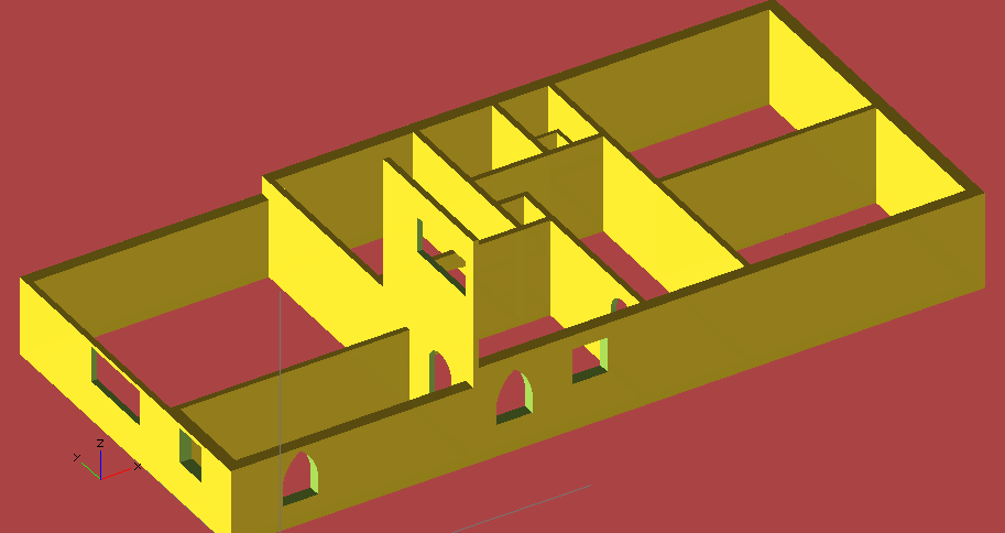 > This is the isometric version from OpenSCAD. Note the conversion is exact and> the coordinate system switched automatically. The sweet thing is all the> interesting stuff with creating any style of wall openings just works!>