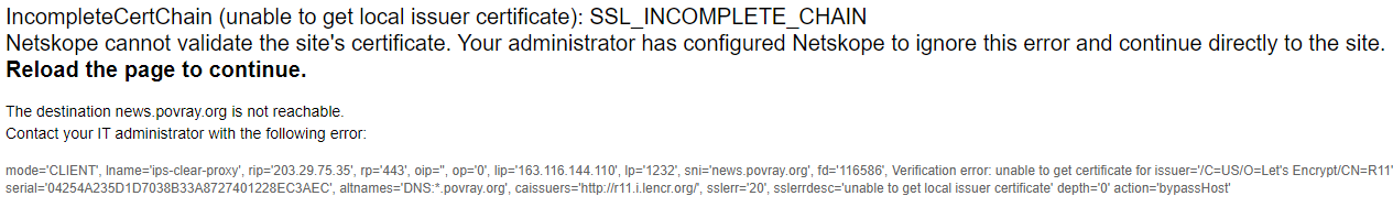 certificate served by the news server is good for povray.org but not for a raw IP