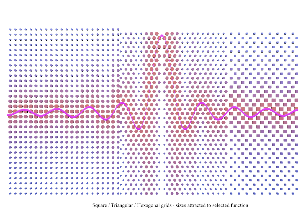 Here's a sinc function that modulates the size of 3 different object grids.