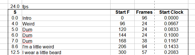 >> put these times in a spreadsheet to get the clock values and frame