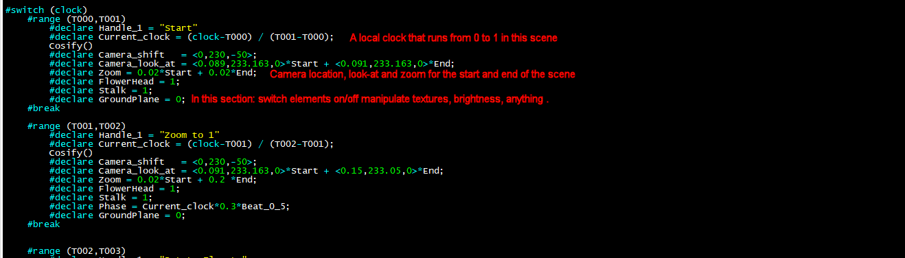 > I put the scene all in one file, the timings go in another (.inc) file,